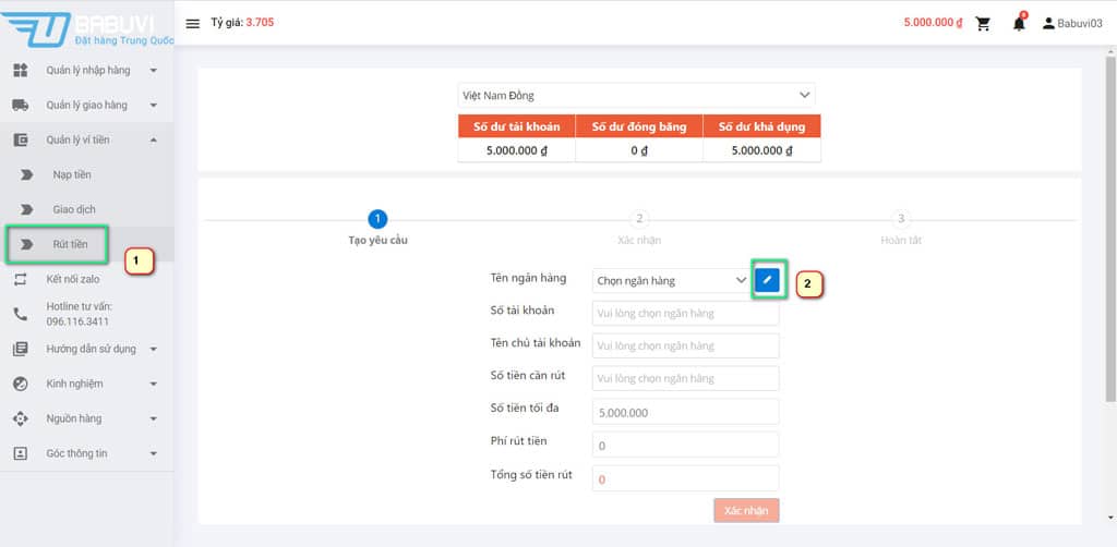 Quý khách cần lưu ý kiểm tra chính xác thông tin trong yêu cầu rút tiền. Nếu quý khách điền sai thông tin và Babuvi đã thực hiện lệnh chuyển tiền thì chúng tôi sẽ không chịu trách nhiệm với các phát sinh liên quan. Mọi vấn đề cần hỗ trợ quý khách vui lòng liên hệ hotline + zalo: 096.116.3411.