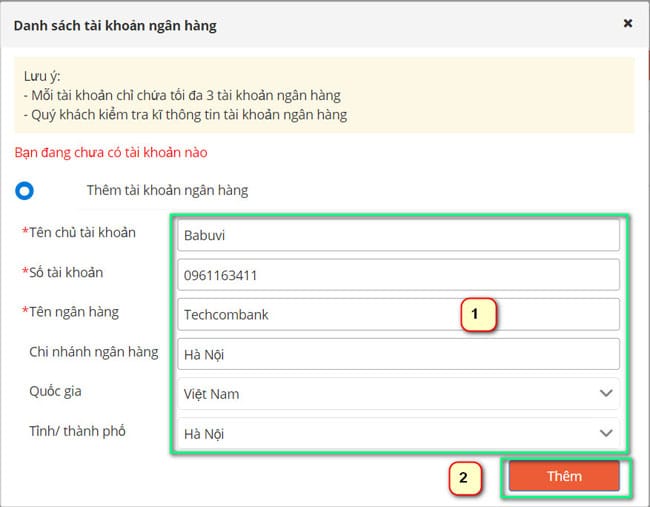 Sau khi nhập hết các thông tin cần thiết bạn hãy bấm vào nút “Thêm” để lưu thông tin tài khoản rút tiền vào danh sách tài khoản của mình.